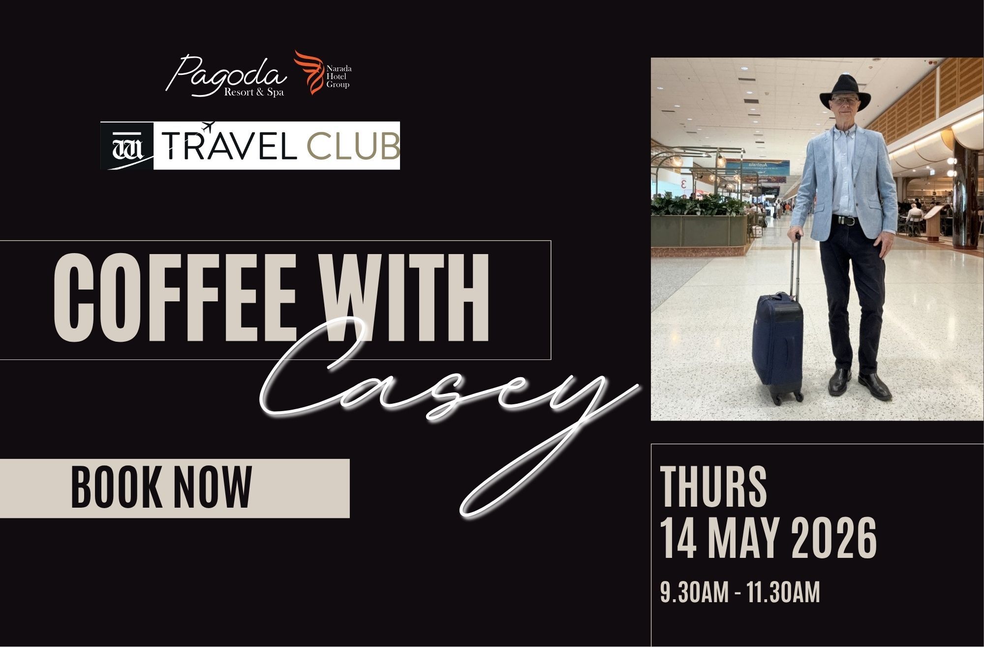 Join us for a delightful morning of travel tales, insider tips, and great company at Coffee with Casey. Travel Editor Stephen Scourfield brings along his trusty suitcase, Casey, known for both impeccable taste and a touch of attitude, for a unique and entertaining presentation. Together, they’ll reveal clever packing tips and tricks, share stories from adventures across the globe (from Africa to Europe, Asia to the Americas), and even give you a peek inside Casey himself.