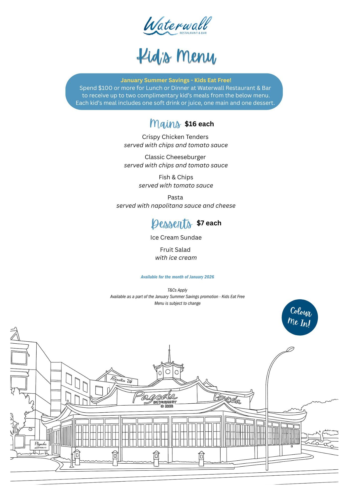 Bring the little ones along! Spend $100 or more on Lunch or Dinner at Waterwall Restaurant & Bar to receive up to two kid's meals.